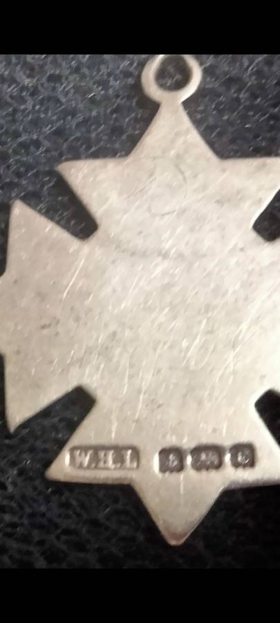 END OF HALLMARKED Fob medal William Henry Leather Birmingham Sterling Silver clearly marked Maltese Cross Shield stamped Hallmark Initials W.H.L. Anchor Lion Passant letter indistinct can not make it out -Birmingham Sterling Silver clearly marked + 1 Sweetheart Brooch back stamped SILVER Enameled front + 1 WW2 Volunteer Pin back stamp SILVER *SOLD AS IS IN PICTURES CONDITION - LISTING