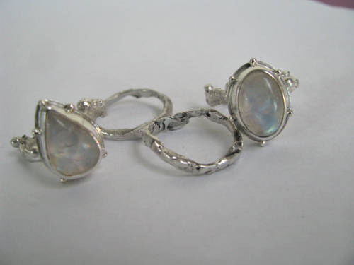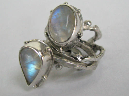 Beautiful rugged and rustic chunky sterling silver Rainbow moonstone stack rings. Ring consist of 4 ring bands.Round moonstone measures 15x10mm and pear 14x10. Ring will fit a size 7.5