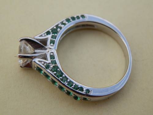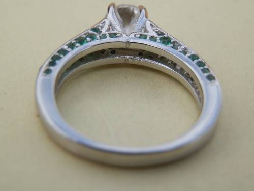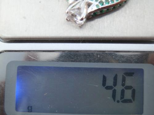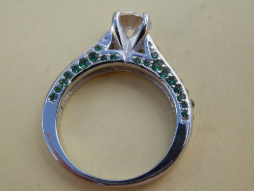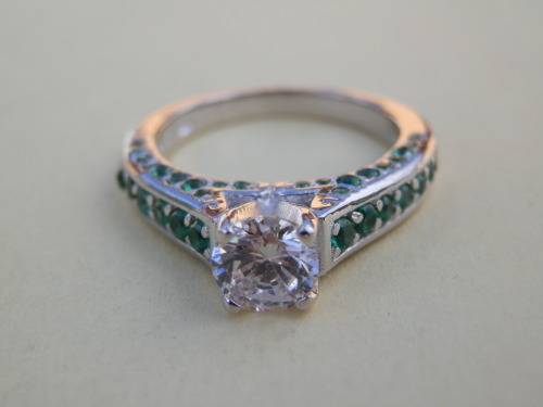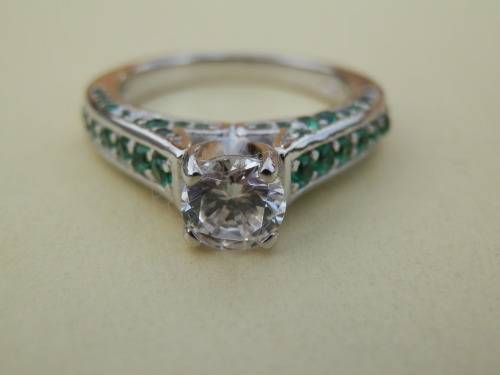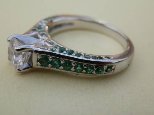 Sterling silver topaz white and accent emerald green gem ring, marked 925 and in new condition.  The size is L / 6, size of the topaz 6 mm and the weight 4.6 g.  This item was bought as a natural white topaz and emerald ring.