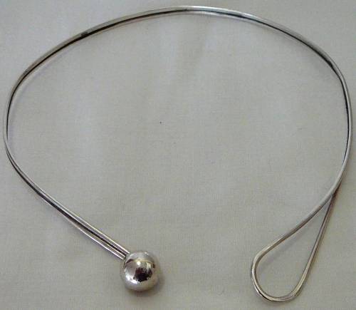 This unusual Sterling Silver Neck Band is 124 mm in diameter, the band which is consists of two flat strips is 4 mm wide, the Ball clasp is 14 mm in diameter and the weight is 24 grams.