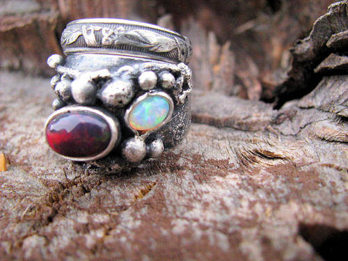 Whisper softly". Beautiful rugged and rustic sterling silver ring with black opal (10x12mm) and one full fire Ethiopian opal(6x4mm).Ring consist of 2 loose bands and can be worn separate.Even thought it's rustic it's very feminine and the colors will keep your eyes busy during the day.It's been lightly oxidized to give it that old world charm. Ring will fit a size 7 (can't be resized)