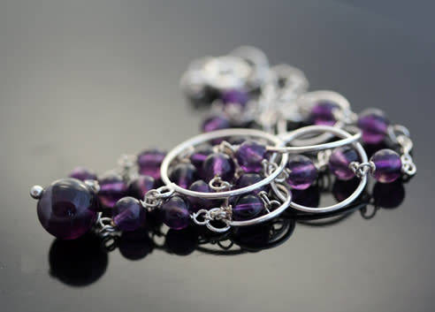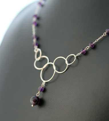 This delicate piece has a geometric design. The neckpiece is a traditional open link sterling silver chain with small round cut deep purple amethyst beads in pairs along the neckpiece, each set of beads are separated by two silver links between the beads. The 'Y' design of the necklace has a focal point at the centre where five slender openwork circles are interlinked, going from smallest to the largest central one, from which dangles the pendant which comprises a small round amethyst followed by a larger one, again separated by two silver open links. The necklace is in good condition, measuring 44.5cm long, with a 40mm long pendant. Weighing 6.43 grams, the piece bears the 925 hallmark indicating sterling silver. Contemporary design and a pretty colour combination make for a striking piece.