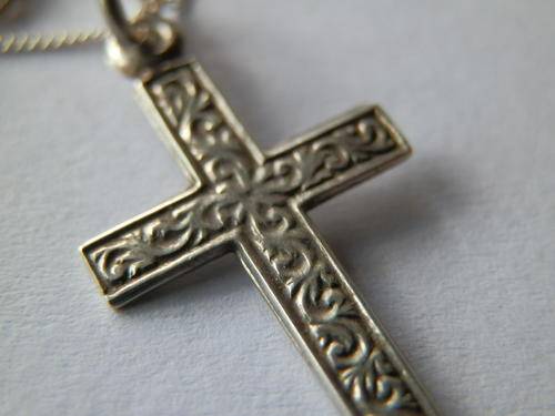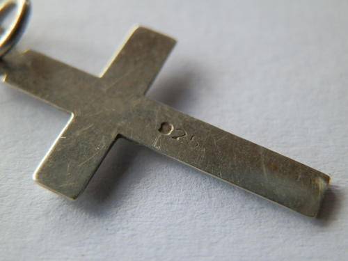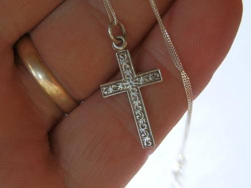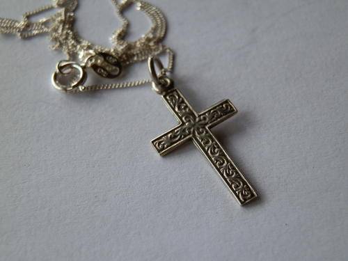 Sweet sterling silver cross pendant and chain, marked 925 and in good condition. The length of the chain is 40 cm, size of pendant 1.3 x 2.5 cm and the combined weight 1.2 g.