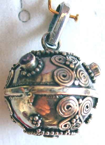 THIS DARLING rattle pendant is accented with a very traditional design on sterling work and - it also has 3 pieces of 2.00 mm round faceted amethysts on the top part of the pendant . This is the perfect gift for that proud new mom! Lovely sterling design and it actually rattles! There is a ring attached so it could be hung as an ornament or from a chain. It measures 25.00 x 17.00 mm , weight 6.02 grams and is designed as a pendant to be worn by a mother - not as a rattle for a child, Or a fun pendant for anyone that likes something different. Thanks for viewing. |