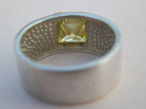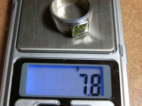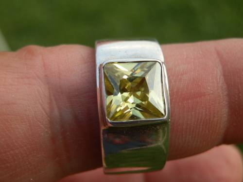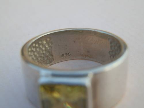 Sterling silver ring set with a yellow-green gem, marked 925 and in good condition. The size is P / 8, top width 9 mm and the weight 7.8 g.