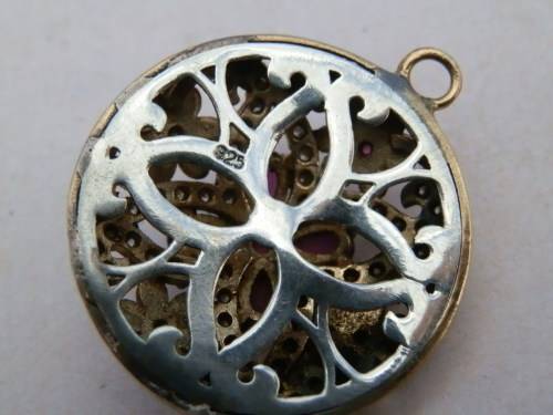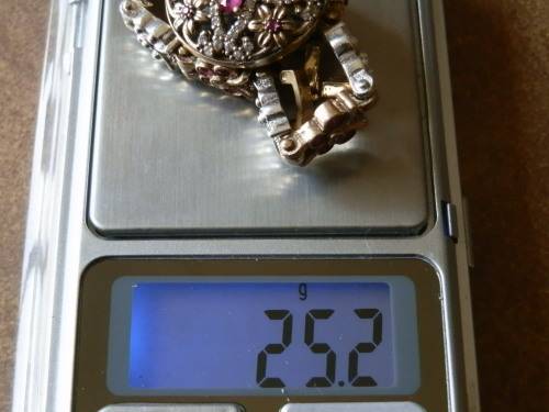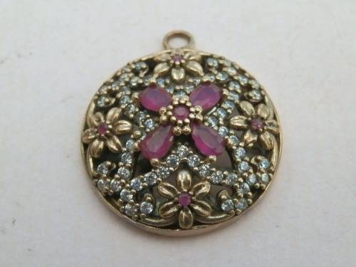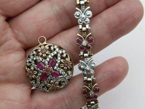 Sterling silver ruby bracelet and pendant combo with bronze accent, both marked and in good condition. The length of the bracelet is 20 cm, the width 9 mm, size of the pendant 25 x 29 mm and the total weight is 25.2 g. The hardness of all the red stones is that of ruby but I can not guarantee that they are natural.