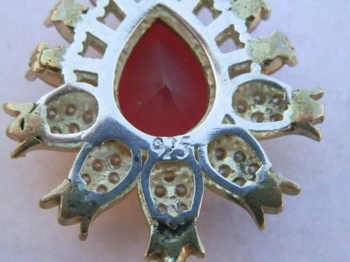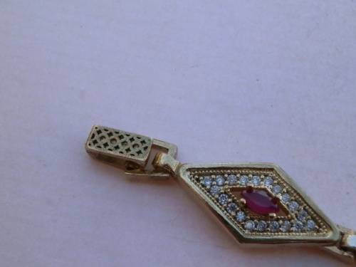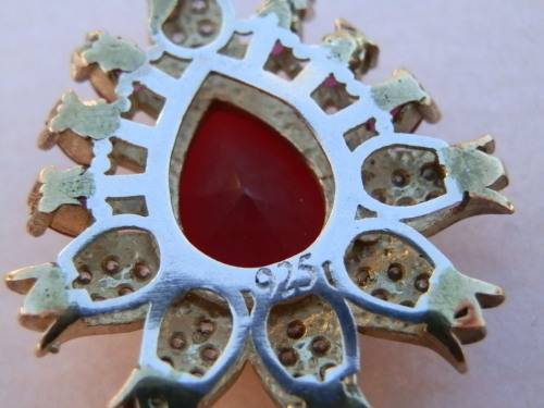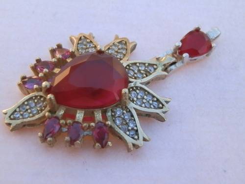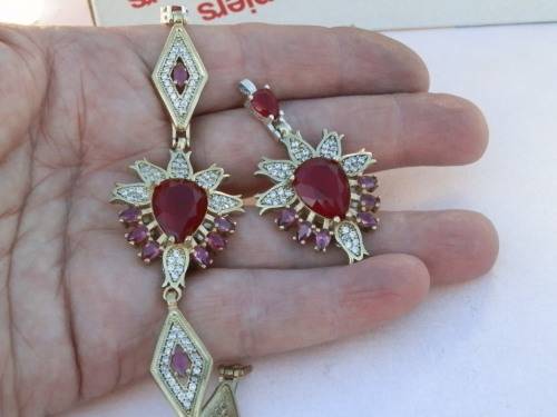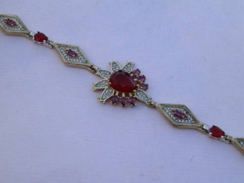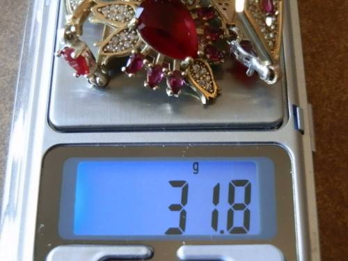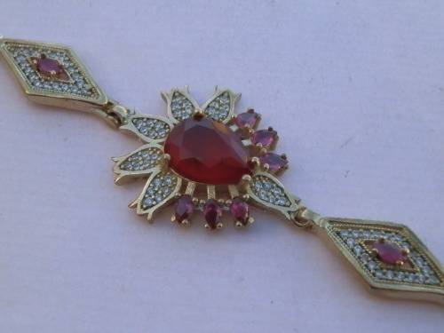 Sterling silver and bronze ruby and topaz bracelet and pendant combo, both marked 925 and in good condition. The length of the bracelet is 20 cm, the width 7 to 30 mm, the size of the pendant 7 x 50 mm and the total weight is 31.8 g. The size of the large red stones is 12 x 16 mm each, the hardness of all the small red stones in the pendant and bracelet is that of ruby but I can not confirm that any of the stones are natural.