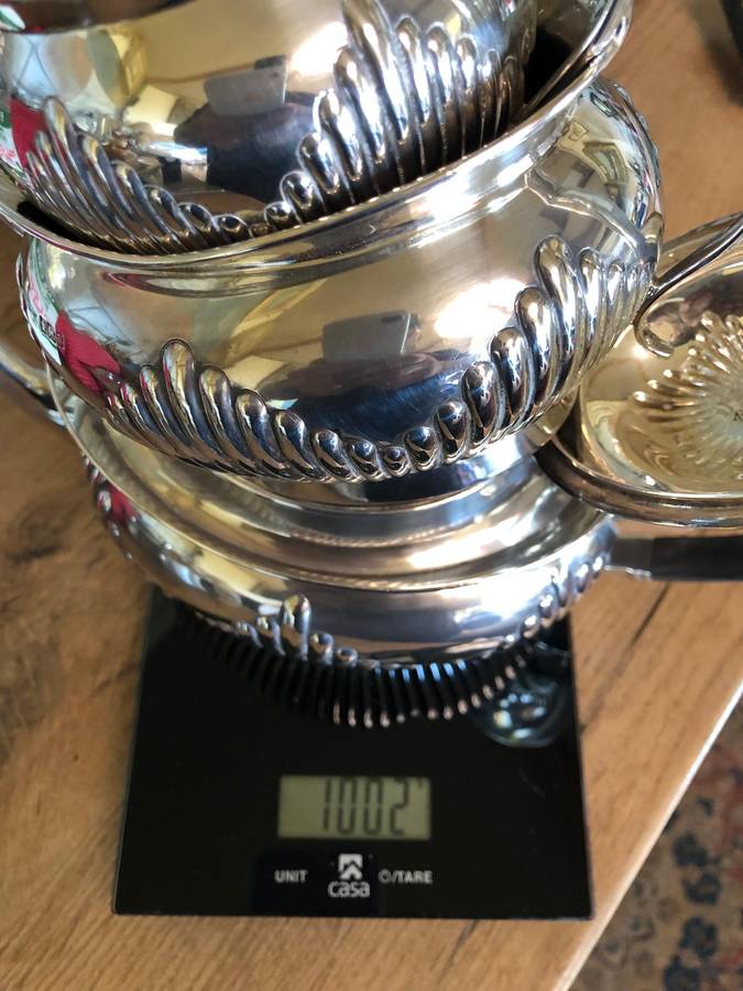 Sterling Silver Sheffield Hallmarked 1893 Tea Set by Mappin and Webb - 1002g - it is in excellent condition , engraved Griffin marking which is usually reserved for Royalty - I could not separate the handle from the pot safely so it is included in the weight