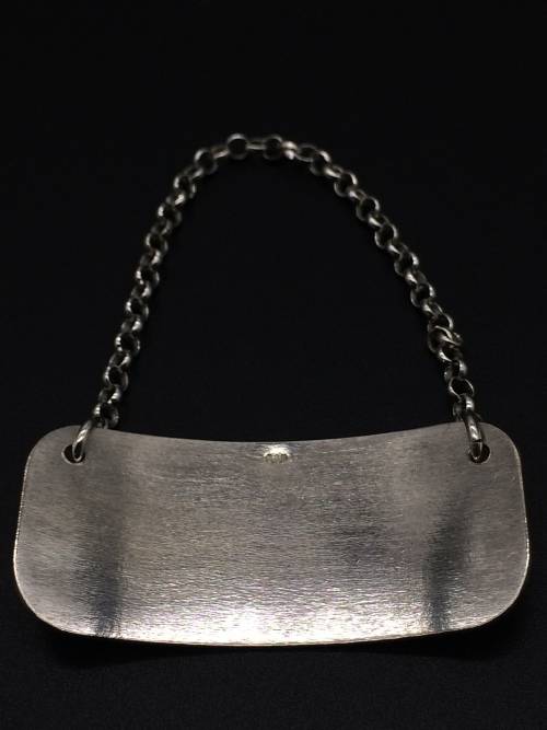 This simple yet stylish sterling silver decanter label is fitted with a silver rolo chain and has the wording Sherry engraved on it. It is stamped 925 on the back and is in excellent condition. It measures 4.8cm x 2.1cm.