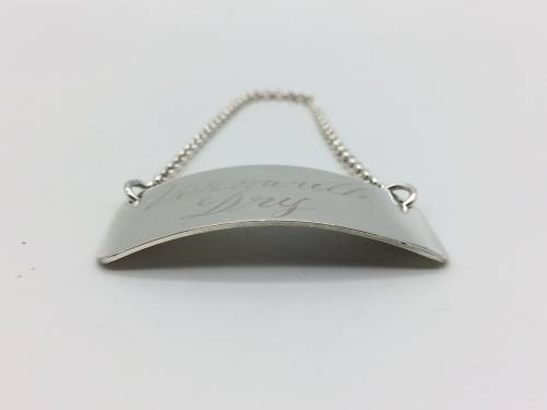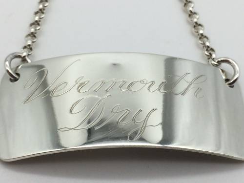 This simple yet stylish sterling silver decanter label is fitted with a silver rolo chain and has the wording Vermouth Dry engraved on it. This wording you dont see very often. It is stamped 925 on the back and is in excellent condition. It measures 4.8cm x 2.1cm.