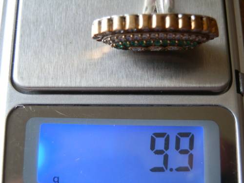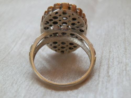 Sterling silver green and white quartz ring with bronze accent, marked 925 and in good condition. The size is R / 9, top width 27 mm and the weight 9.9 g.