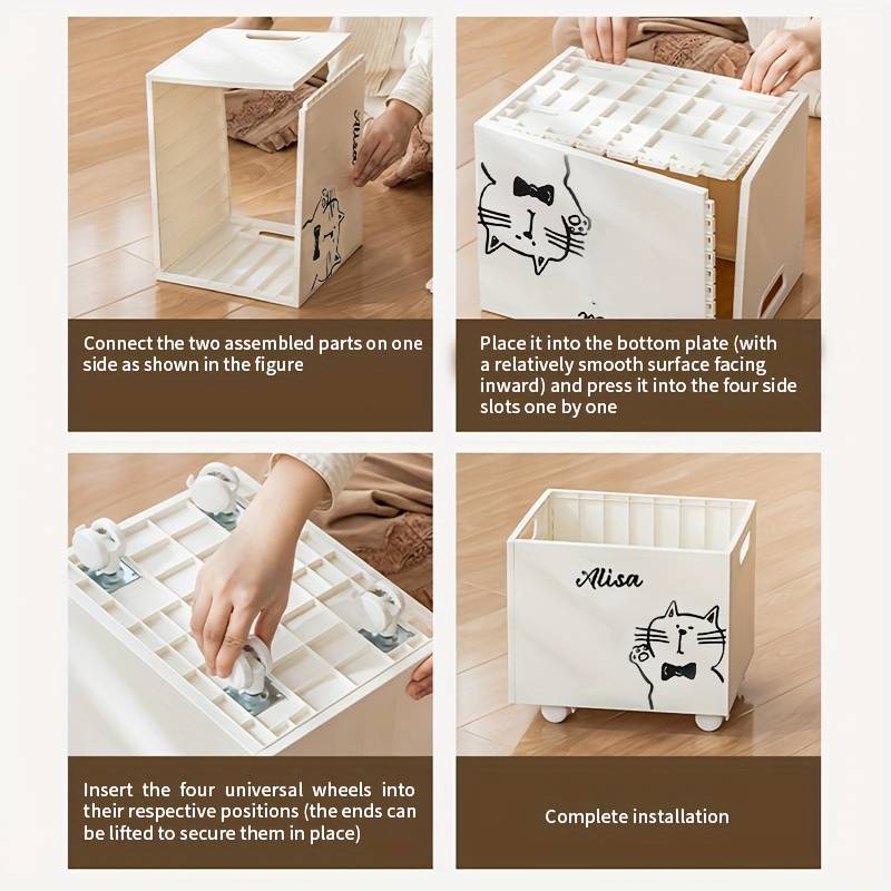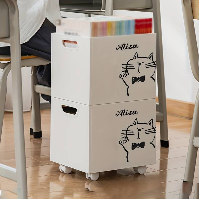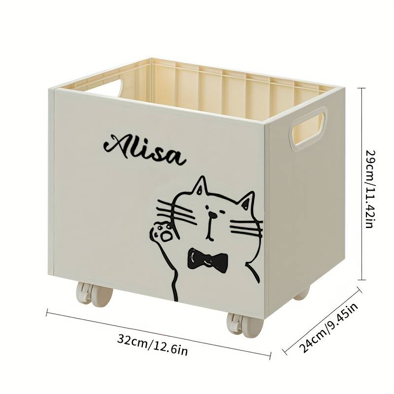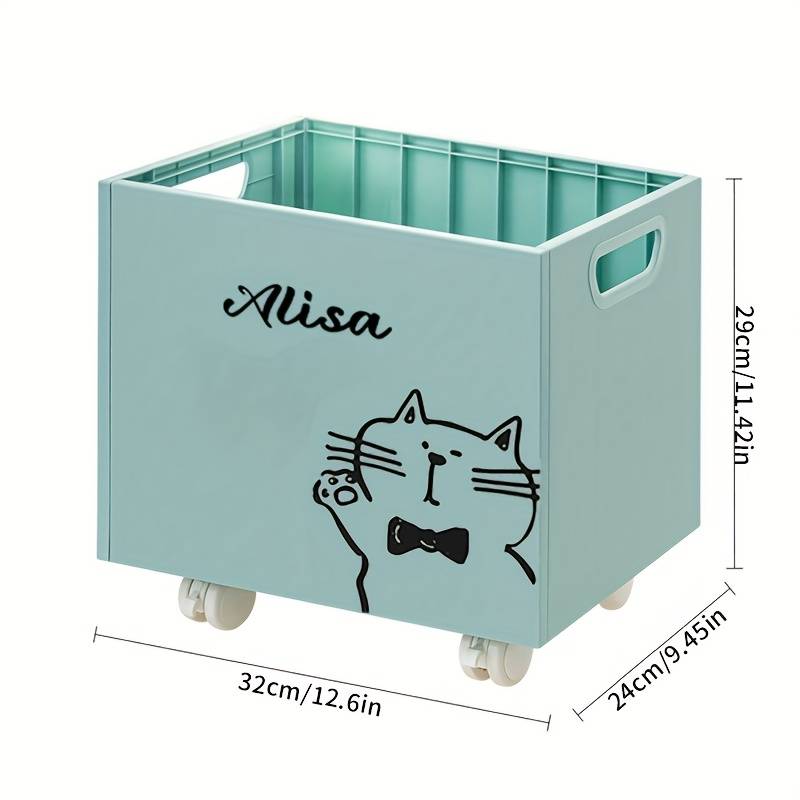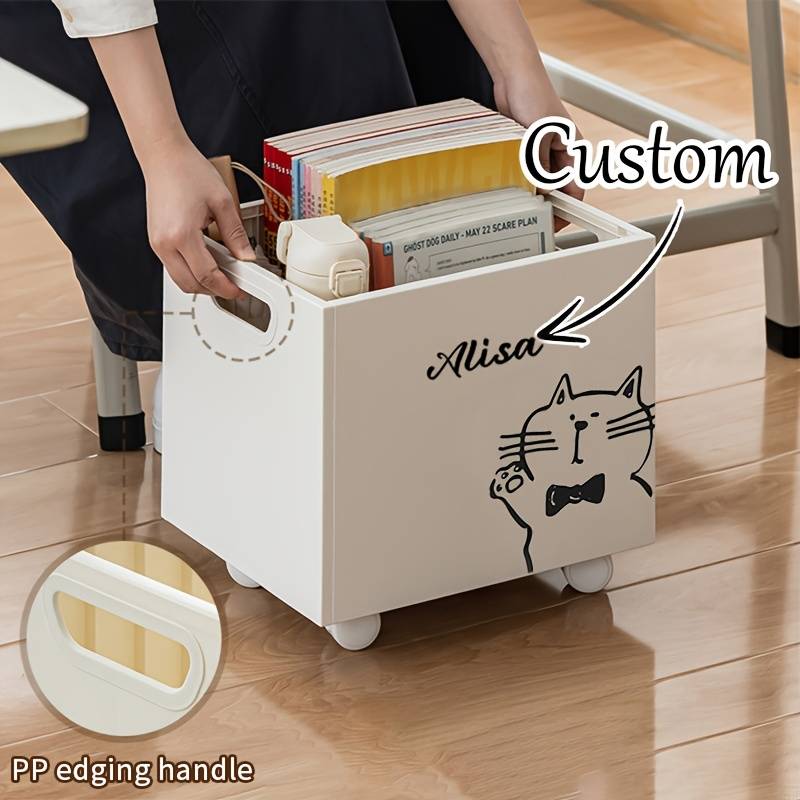 A versatile and personalized plastic storage box with wheels for easy mobility, featuring a charming cat design. This sturdy and thick box is perfect for organizing student books, toys, clothing, snacks, and other miscellaneous items.