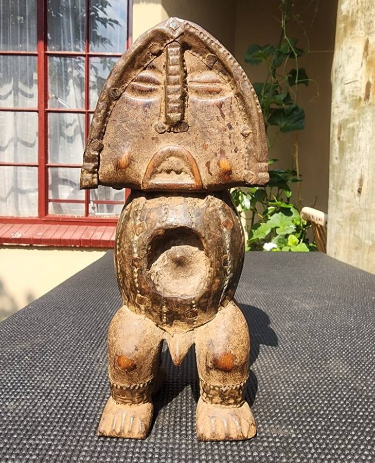 NOTE I HAVE VARIOUS INTERSTING AFRICAN ARTIFACTS ON AUCTION THIS WEEK. STRANGE WOODEN CARVED BOWLS AND GOURDS TO OLD AFRICAN POTTERY LAMPS AND MUSICAL INSTRUMENTS. ALSO AN AFRICAN LUBA DRC PIPE.