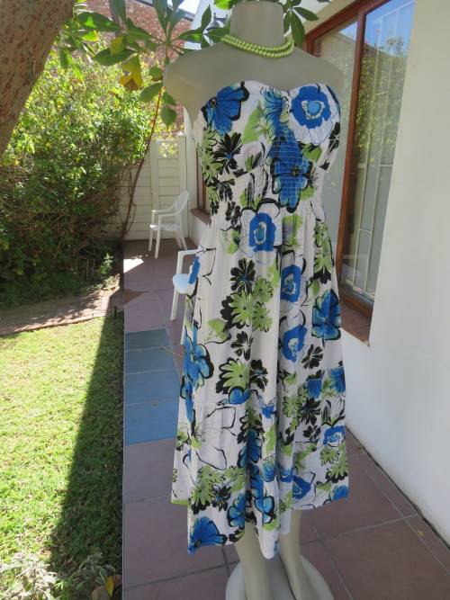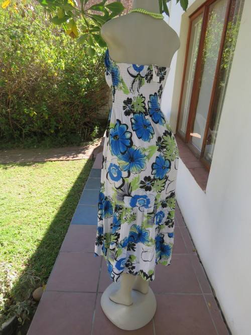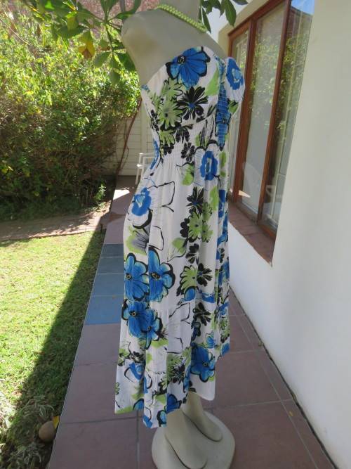 Strapless beach dress by 'HONG LI LA' in 36/12.In white with blue,black and floral pattern.Wide elasticated middle and full back tiered skirt.In stretch poly cotton.Good cond.