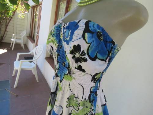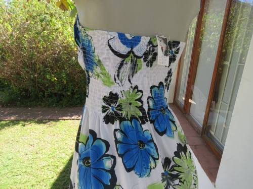 Strapless beach dress by 'HONG LI LA' in 36/12.In white with blue,black and floral pattern.Good cond