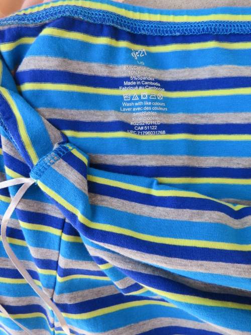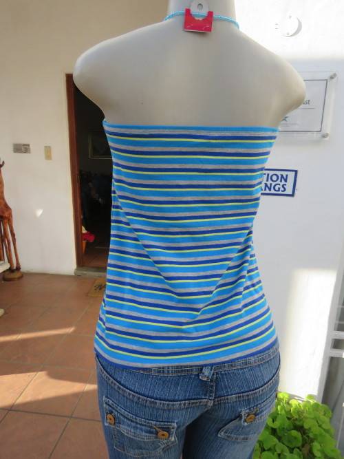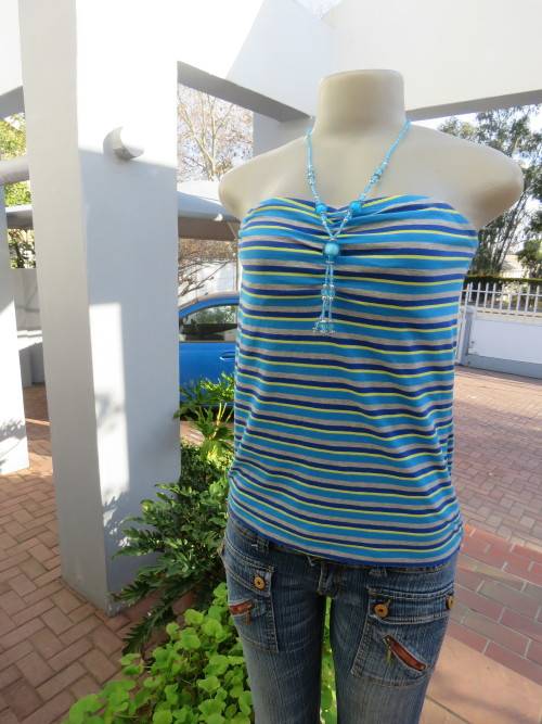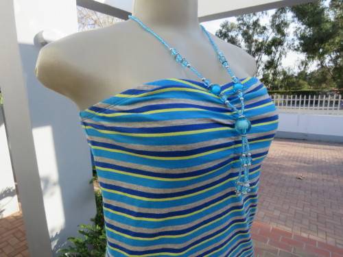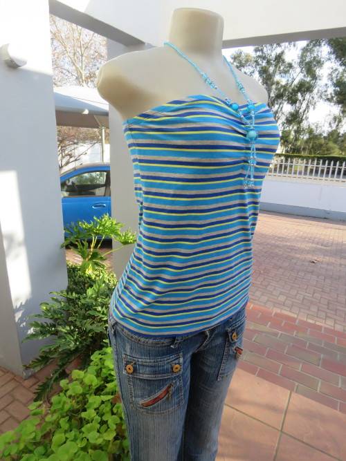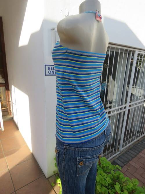 Strapless summer top in blue,grey and yellow horizontal stripes.Size 34/10.New condition.