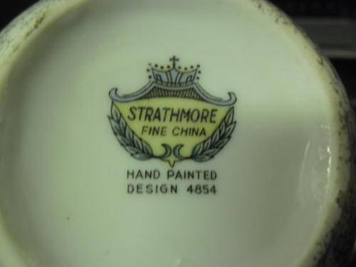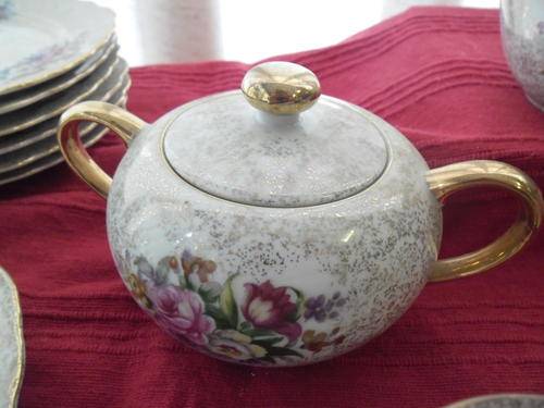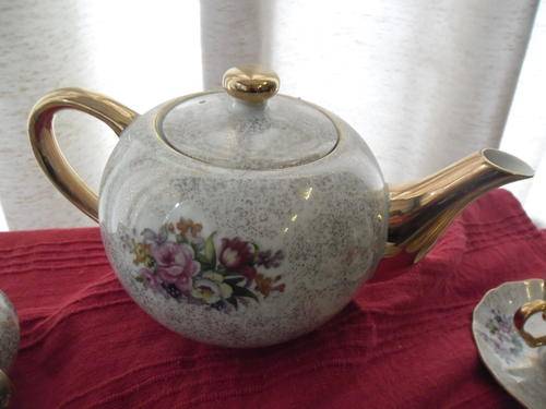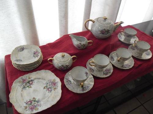 VERY PRETTY TEASET WITH TEAPOT WITH LID, SUGERBOWL WITH LID, MILKJUG, BIG PLATE, 6 SMALL PLATES, 5 CUPS AND SAUCERS (MISSING ONE SET). NO CRACKS-VERY GOOD CONDITION-NORMAL WEAR AND TEAR MARKS. HAND PAINTED NUMBER 4854.