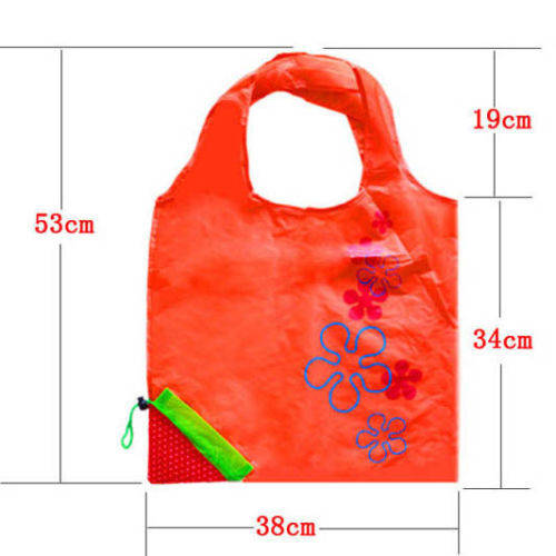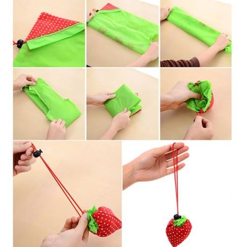 when not in use, the bag can be scrunched/folded up into a handy cute strawberry and can be kept in handbag, car, hang on baby buggy, etc...