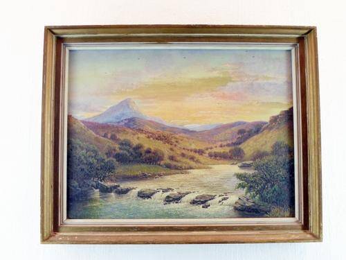 A serene stream in a landscape with the mountains in the distance. This calm river scene is simply outstanding in composition. It measures 50cm x 37cm and the frame measures 59cm x 46cm. Spoil yourself, bid now!!