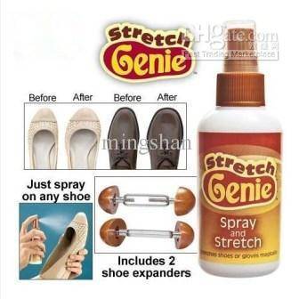 Say goodbye to the pain and discomfort of tight-fitting shoes with the miracle stretching system that will customize the fit of your shoes. Stretch Genie Liquid Shoe Stretching System As Seen On TV penetrates leather to relax and soften fibers. Expanders have adjustable contoured knobs that reach narrow, tight-fitting areas. Specially designed expanders gently expand shoe width of toe box and heel. Provides immediate relief from wearing ill-fitting shoes. Eliminates the need to "break-in" shoes. Relieves discomfort from common foot problems such as bunions, corns, calluses, misshapen hammertoes, and uneven foot sizes.