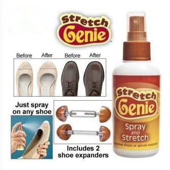 Stop pain from cramming feet into shoes that don't fit! Dual Stretch Genie™ system combines finesse and muscle to comfortably expand shoe widths for a custom fit without harming the shoe's integrity. Flex formula softens and relaxes leather so shoes break in instantly. Adjustable expanders use delicate pressure to create space and widen shoes. Great for bunions. Works on gloves too! Formula: 4 oz, Expander: 2 3/4 x 4 3
