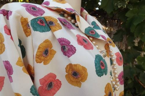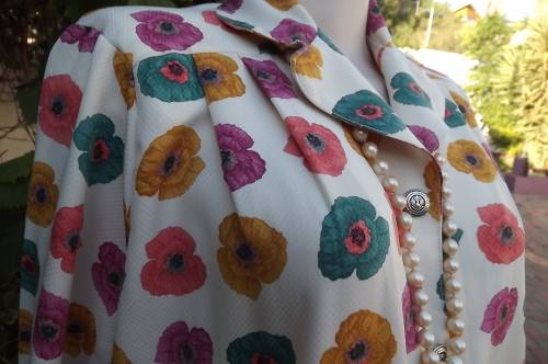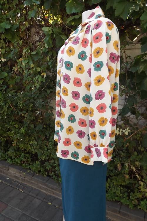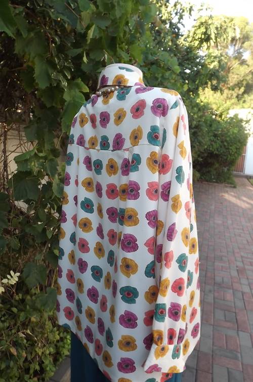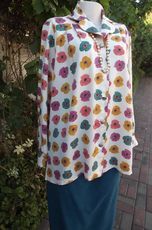 Striking cream long sleeve blouse covered with various colour poppies.Size 42/18.Button down front with open collar.Pleats on shoulder fronts. Slitted sides.In wash + wear polyester.As new