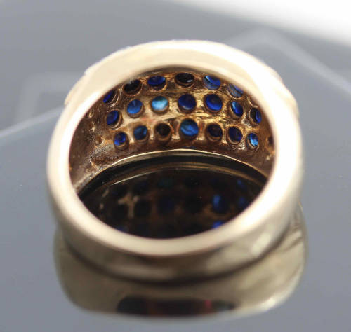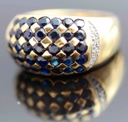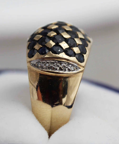 A particularly large and striking piece, the checkerboard effect of alternating sapphires and gold is eyecatching! The ring head is wide at 21mm across; the 35 round-cut sapphires (1,6 carats in total) of various beautiful deep blue hues, are between 2,3mm and 2,5mm each, creating a strong geometric design with the brightness of yellow gold in between. An ellipse of diamonds curves softly on each shoulder, 5 x 1mm round-cut diamonds on each side, bracketing the ring head and providing a glittering contrast to the checkerboard. The head is softly dome-shaped, and smooth to the touch. Heavy at 7,1 grams, the heavy gold content around the ring head continues to the thick gold shank, which narrows as the back for comfort. A gorgeous and unusual ring that will appeal to someone who loves their rings bold! An independent jeweller certificate for R18'188 will accompany the ring.