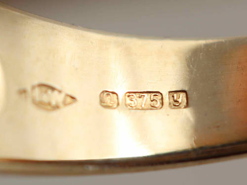 The ring bears the hallmark '375' for 9ct yellow gold, the Birmingham import assay, the jeweller's signature and the date 1998.