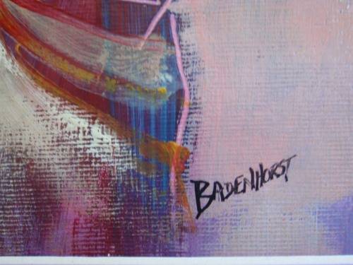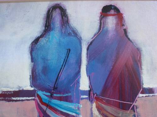 STRIKING ORIGINAL PAINTING, SIGNED by THE ARTIST, BADENHORST - 'WARRIORS' - FRAMED IN RUSTIC, NATURAL WOOD FRAME - BEHIND GLASS. SIZE: 42M X 35CM (TOTAL SIZE INCLUDING FRAMING) SIZE OF PAINTING ON ITS OWN 26CM X 18.5CM.