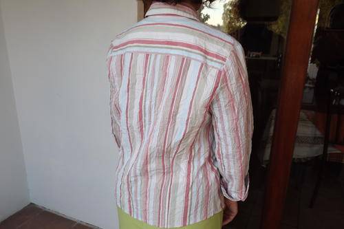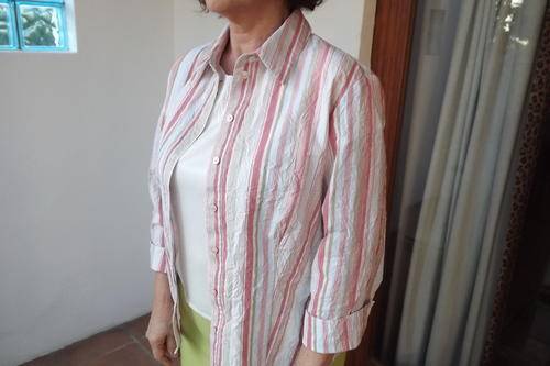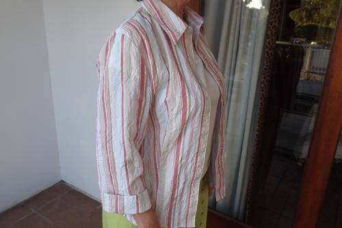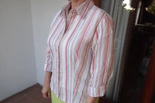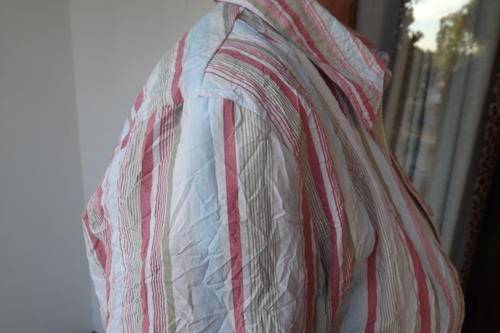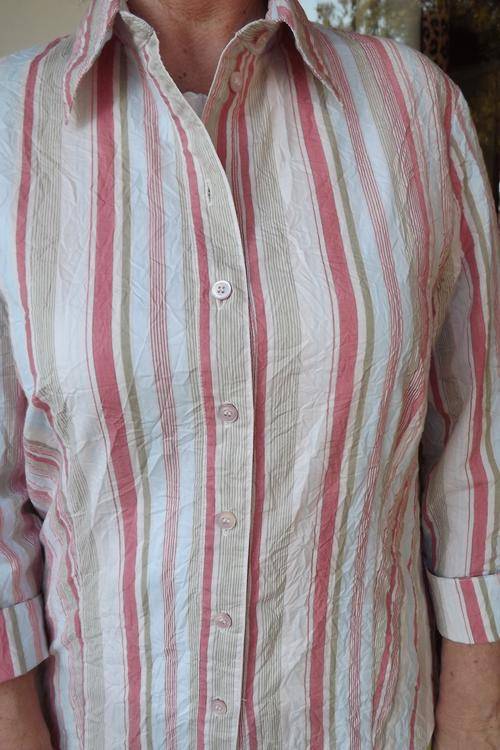 Striped Shirt in creased polycotton. Beige,apricot and avo.Size 36/12. Shirt collar. Good condition.