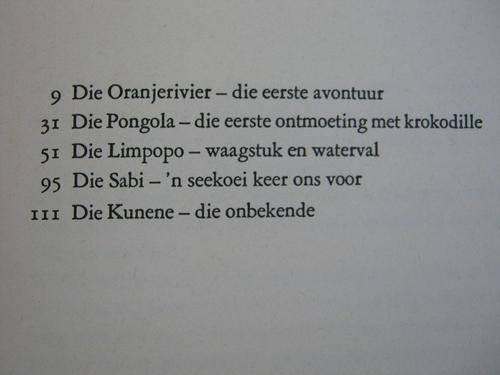 Tafelberg-Uitgewers, 1975. Avonture op die Oranje, Pongola, Limpopo, Sabi, Kunene. Hardeband, 158 bladsye, met swart en wit foto's. Die boek is in 'n goeie toestand. Die bladsye het begin verdonker. Minder as 1kg.