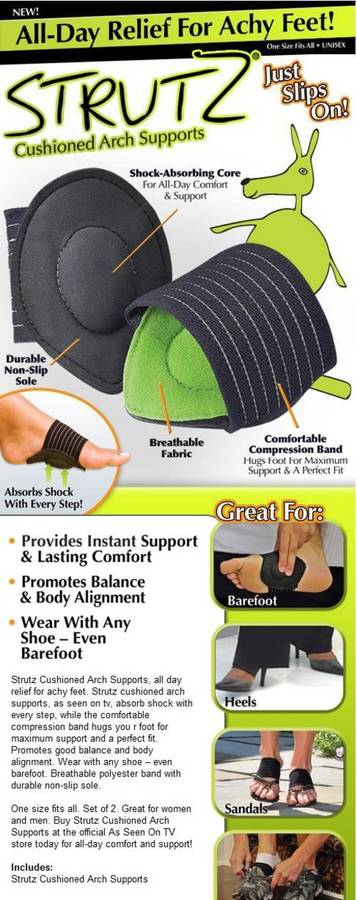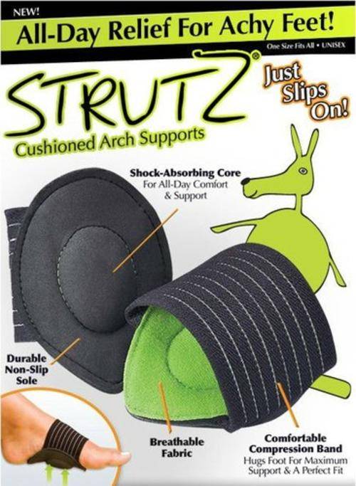 The Strutz revolutionary product is designed to provide immediate relief to those with sore feet, knee and back pain caused by poor arch support. Endorsed by world-leading podiatrists, orthopedists, chiropractors and athletes, Strutz reduces heel, arch and ball of foot pain caused by flat feet, fallen arches and plantar fasciitis.