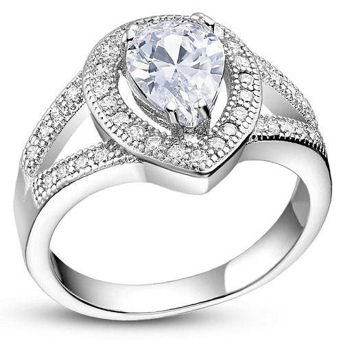 This beautiful pear cut engagement ring is the epitome of elegance. It has dazzling accent stones bordering the middle pear shaped stone. It has a double split shank on both sides embedded with smaller round cut stones. This ring features a four prong set center stone and is glittering with beauty and class.