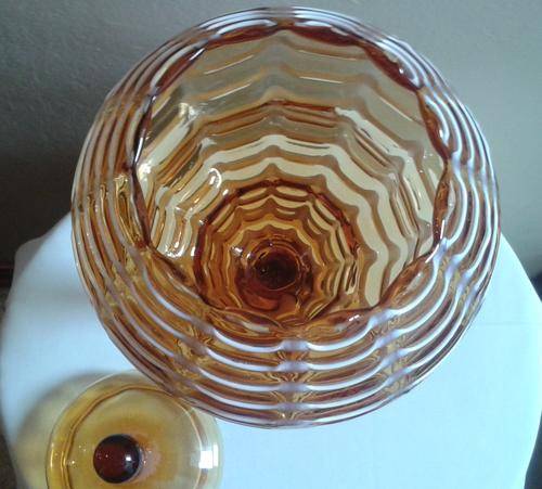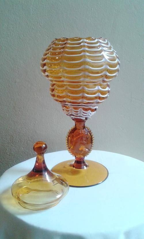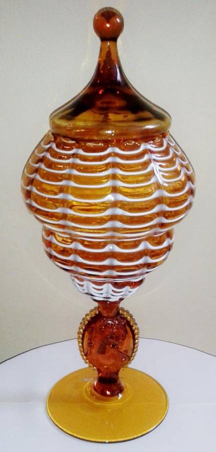A beautiful amber and white glass candy dish with lid. Height with lid is approx 39cm and the base of the dish is approx 13,5cm wide.