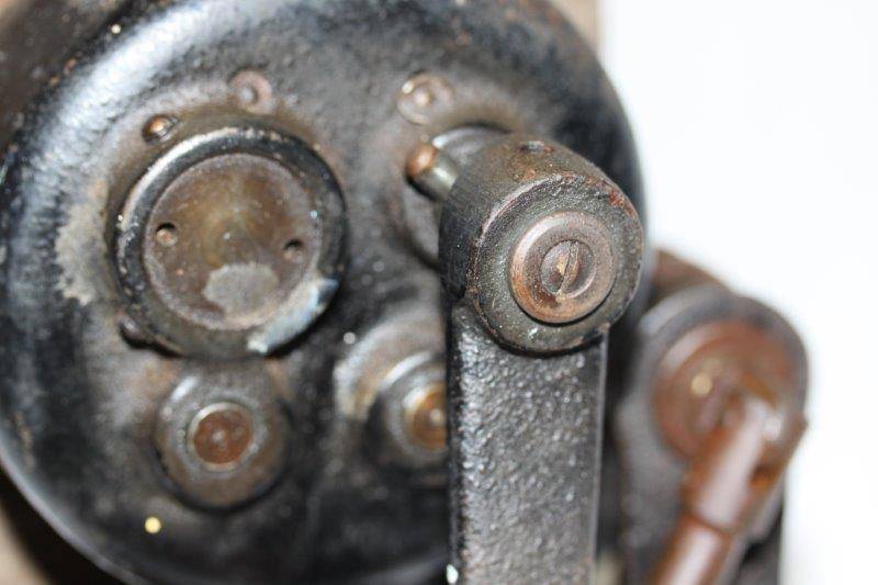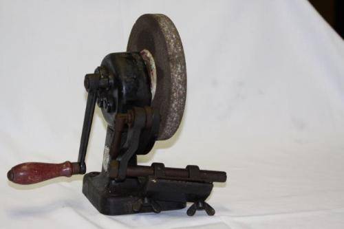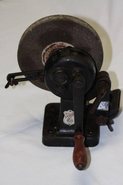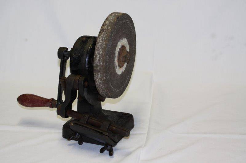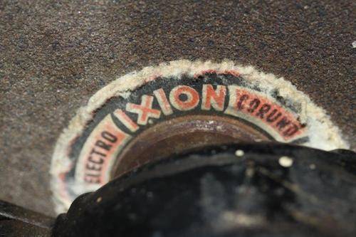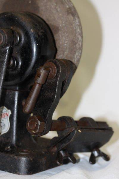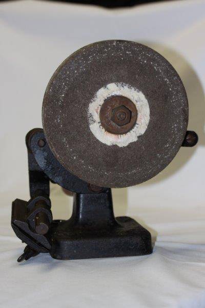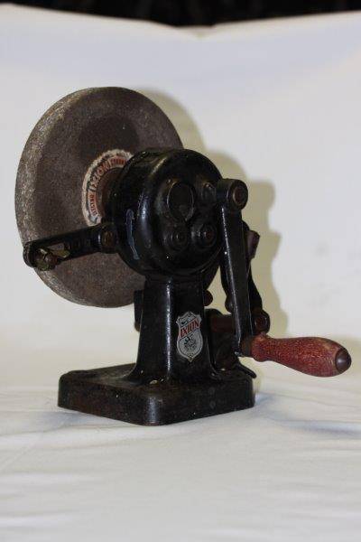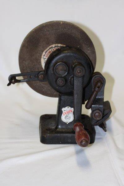THIS AWESOME ANTIQUE IXION (GERMANY) GRINDING WHEEL IS STILL IN GOOD WORKING CONDITION AND THE GEARS ENGAGE PERFECTLY AND VERY SMOOTHLY!!! THE GRINDING STONE CAN BE MOUNTED TO A WORK BENCH AND CAN BE A VERY FUNCTIONAL PIECE OF WORKING EQUIPMENT! THIS GRINDING STONE EVEN COMES WITH THE HOLDING CLAMP. THIS IS REALLY A NICE OLD PIECE OF HISTORY!!!