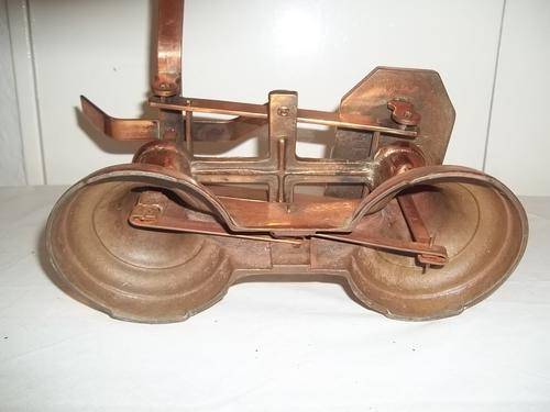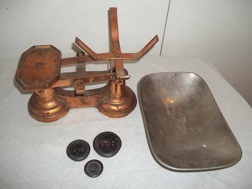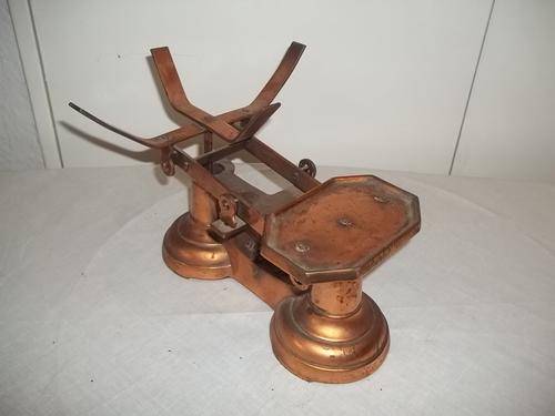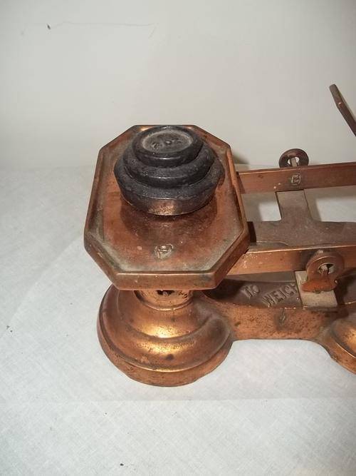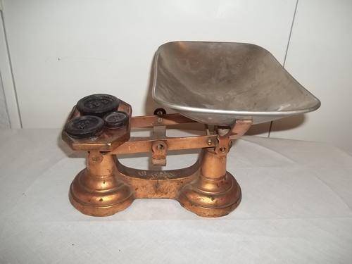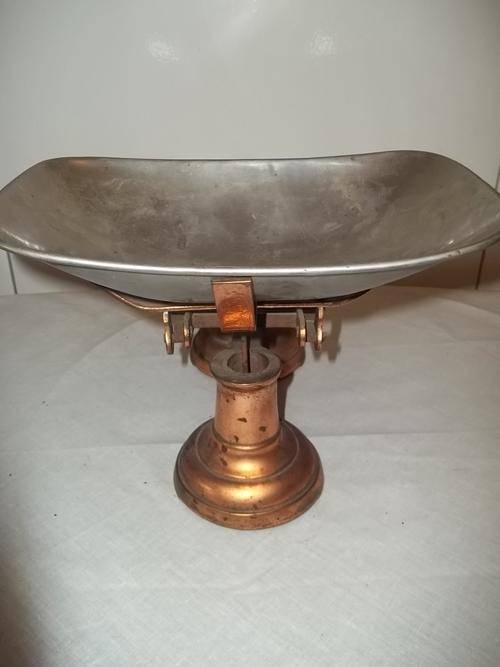 THIS REALLY STUNNING ANTIQUE COPPER SCALE HAS AN ALUMINIUM TRAY AND THREE BLACK CAST IRON COUNTERWEIGHTS (2, 4 AND 8 oz). THE SCALE HAS BEEN USED A LOT, WHICH ADDS TO THE ALL ROUND APPEAL OF THE SCALE. THE SCALE CAN WEIGH UP TO 7 lb. THIS REALLY IS A SPECIAL PIECE AND SOMETHING VERY COLLECTABLE.