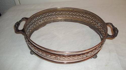 THIS MAGNIFICENT ANTIQUE SILVER PLATED DECORATIVE SERVING DISH HOLDER MEASURES 32cm (HANDLE TO HANDLE) x 19cm WIDE x 7.5cm DEEP. THE HOLDER CAN TAKE AN OVAL SERVING BOWL THAT MEASURES 25cm x 19cm X 7.5cm. THIS BEAUTIFUL HOLDER HAS SEEN SOME AGE RELATED WEAR AND TEAR AND TARNISHING, BUT IS STILL AN AMAZING PIECE WITH THE SILVER PLATE AND COPPER EFFECT. IT WOULD ADD CHARACTER TO ANY FANCY DINNER PARTY.