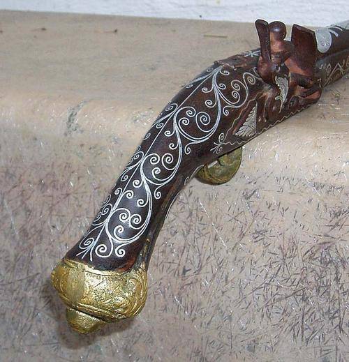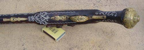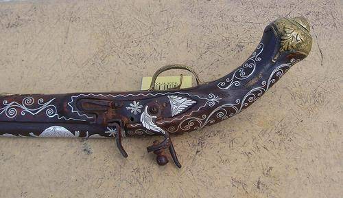 VERY NICE VINTAGE LOOKING ORNAMENTAL ANTIQUE STYLE PISTOL. SOLID EXOTIC MAHOGNANY LOOKING WOOD FRAME WITH BRASS MOUNTS, METAL ACCESSORIES, SIGHTS, LOADING GADGET ETC. REALLY BEAUTIFUL PIECE, LOTS OF INTRICATE ALUMINUIM INLAY TO BOTH WOOD AND METAL BARREL, PLUS SOME ACCESSORY METAL PARTS........MANY HOURS OF PAINSTAKING EXPERTISE TO MAKE THIS HIGHLY DECORATIVE ITEM. IT WOULD MAKE A STUNNING DISPLAY IN A PUB OR OFFICE, STUDY.....IN FACT ANYWHERE. LOOKS LIKE THIS WAS RECENTLY REFURBISHED BECAUSE IT IS IN FINE CONDITION, SOME PROFESSIONAL ODD SMALL REPAIRS TO WOOD, BUT NOW IN EXCLELLENT CONDITION, NO MISSING INLAY. BRASS TRIGGER MOVES. MEASURES A NICE 53CM LONG AND 4CM DEEP ACROSS MAIN TOP SECTION. A WOW ITEM.
