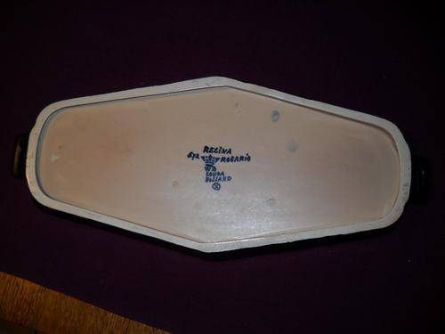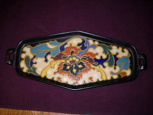 GEOMETRICAL CURLY ORIENTAL LOOKING DESIGNS,TYPICAL FOR THE PERIOD; MATTE GLAZE,VIBRANT COLOURS ON BLACK BACKGROUND ;A REAL BEAUTY ; SIZE 15,5X36,5 CM;HAS ORIGINAL REGINA FACTORY STICKER ON THE SIDE OF THE RIM