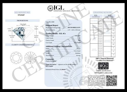 Offered and sold as an IGL LAB certified diamond only as per their report, we are not liable for any 3rd party opinion compared to this report.