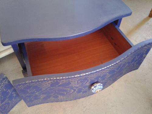 Stunning bedside tables painted in royal blue with gold lace print stencil. Added ceramic knobs and brass feet.