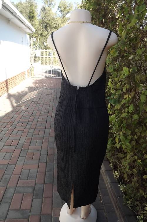 Stunning black dress suitable for evening wear.In polyester bubble fabric.Size 34/10.pencil style with slit at back.Rounded low v front with lace inlay.Thin shoulderstraps.Boutique made.New condition.