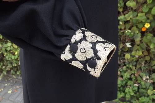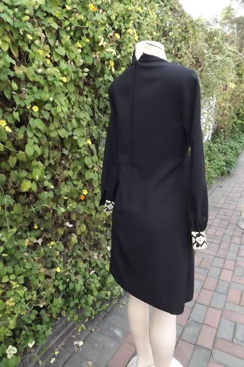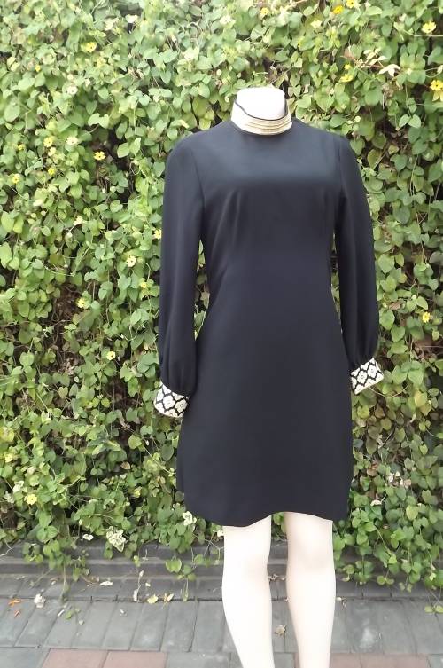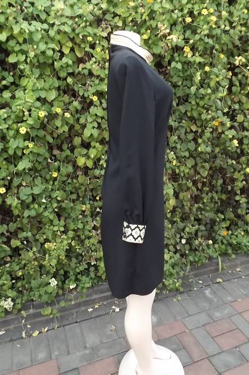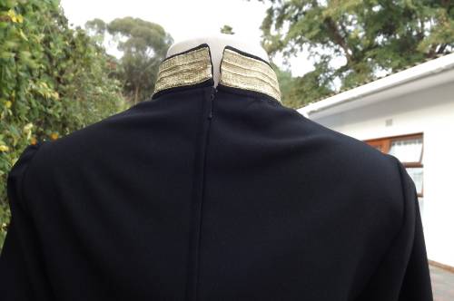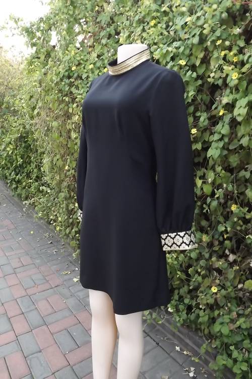 Stunning black knee length "Cosmopolitan" dress. Purdy style.Size 36/12.high banded collar with gold colour decoration.Long sleeves with gold and black.Floral cuffs.Different and beautiful.As new
