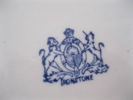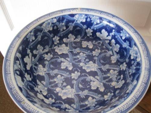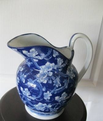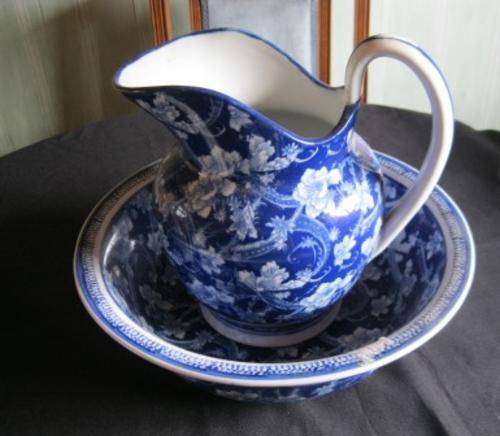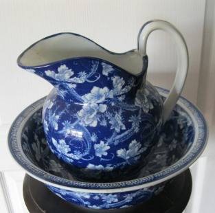 You are bidding on a Blue & White ironstone Jug and Basin decorated with flowers, which is in mint condition, the basin is 23cm x 18cm and the Basin is 28cm dia x 10 cm high.