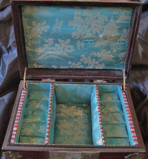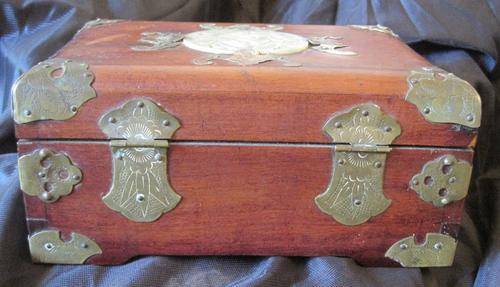 Stunning brass-bound Jewellery box, with mother of pearl detail