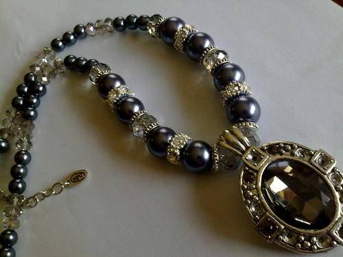STUNNING!!! CHARCOAL OVAL CRYSTAL TIBETAN SILVER DARK PURPLE PEARLY NECKLACE
