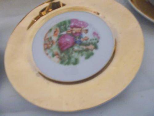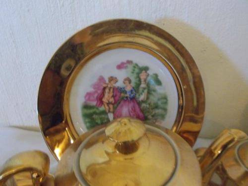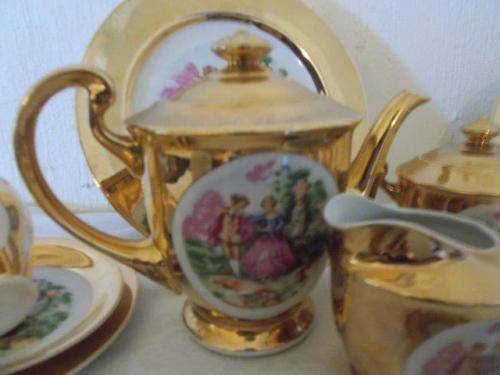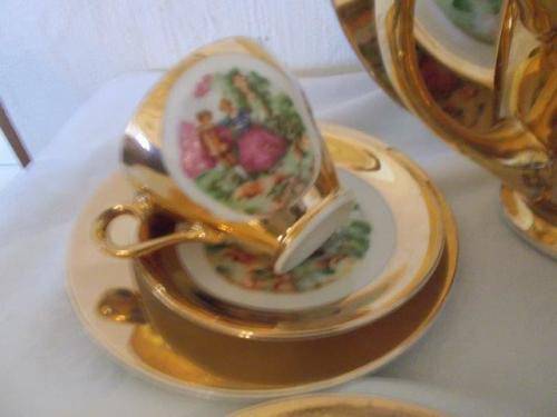 kindly note we use door only at the cost of R 170 to send nice gold in color complete romantic scene tea set items are in good used condition the lot consists of 6 tea cup trios and milk and sugar bowl with tea pot and cake plate all in good used condition some very slight wear on the gold due but not much no chips or cracks noted please have a look at my other listings * bronwyn's collectables * thank you
