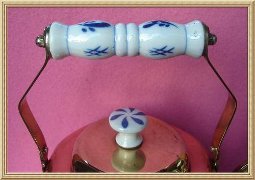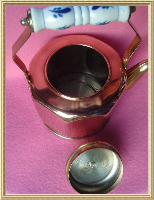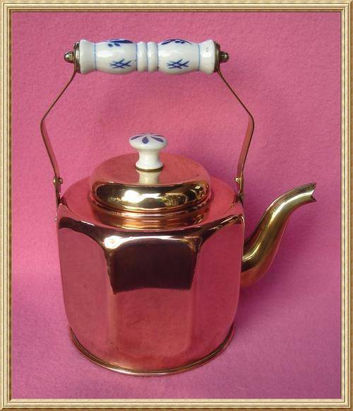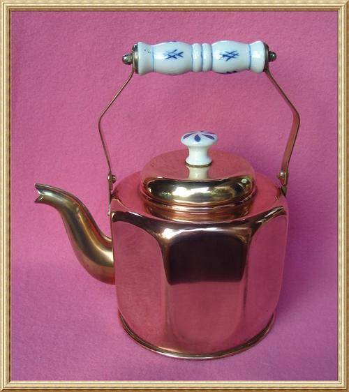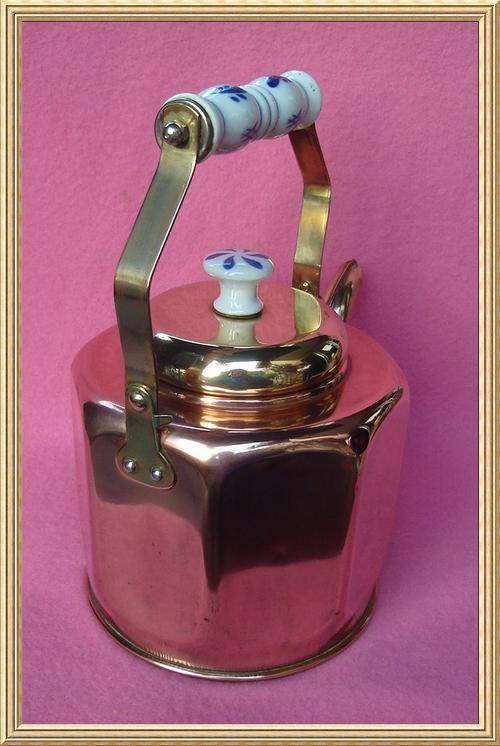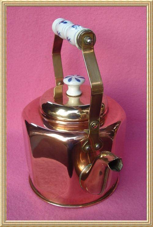 A Stunning Copper & Brass Kettle with Blue & White Porcelain Handle & Finial, in good condition, 24cm height, 22cm width, 610gsm weight.
