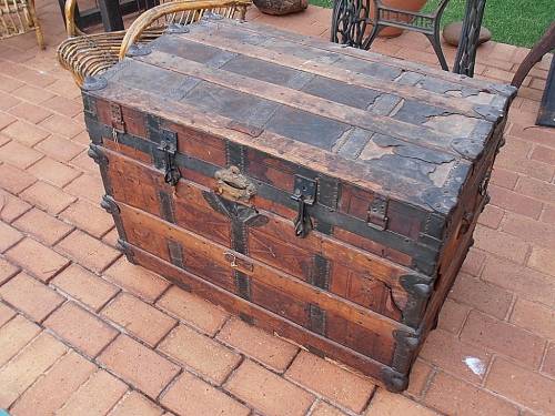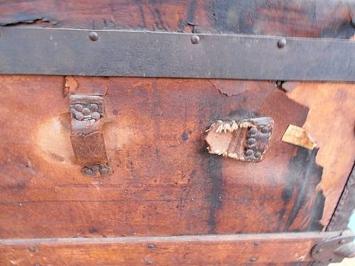 Large vintage travel trunk by Geo. B. Bains & Sons, Philadelphia, USA. Makes a great decoration piece. Very solid and strong, signs of wear over the years, many parts of the thin leather have come loose. One iron fitting of a "leg" is missing, the trunk stands straight but it is slightly wobbly when you move it, a small piece of wood or other support will take care of that. Width 92 cm x depth 57 cm x height 66 cm.