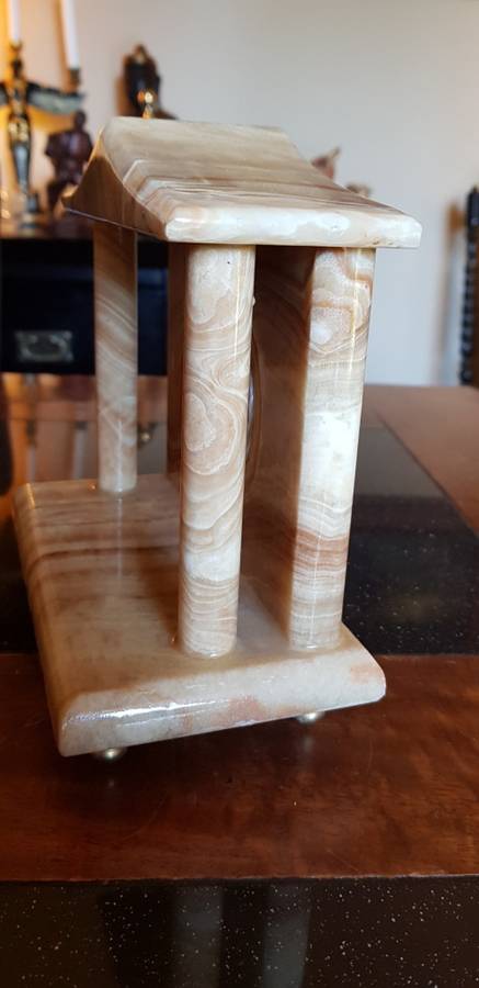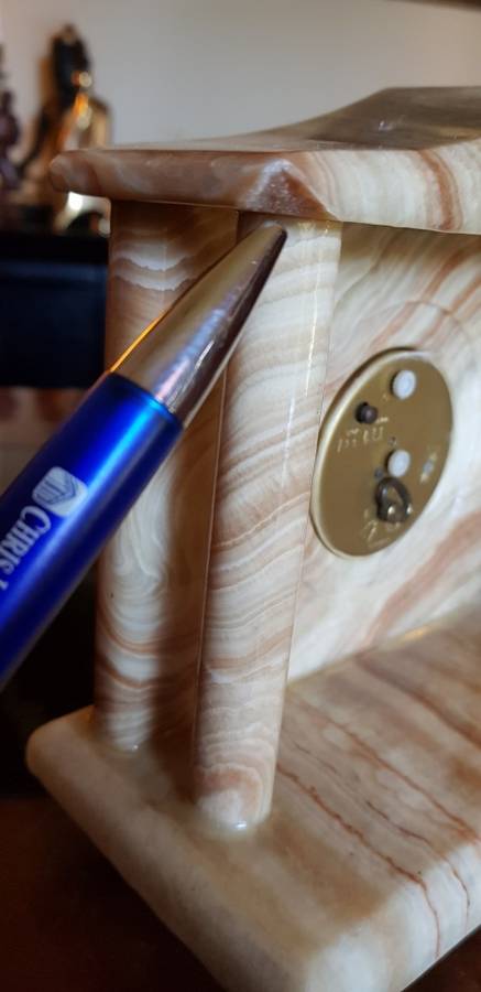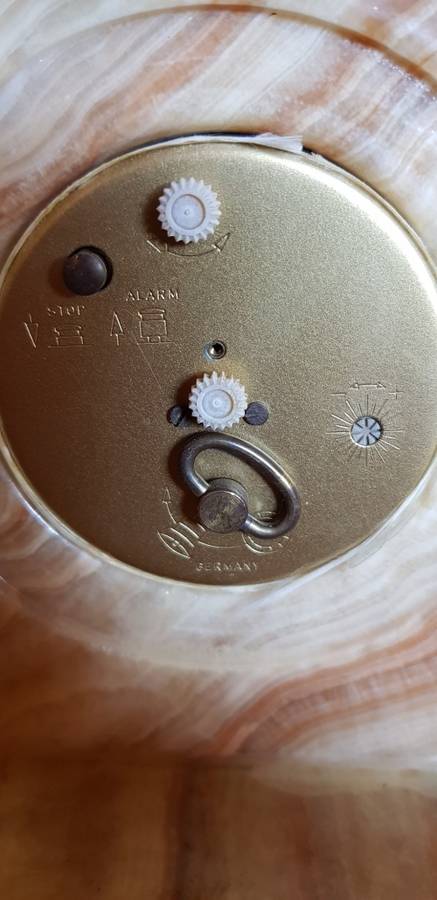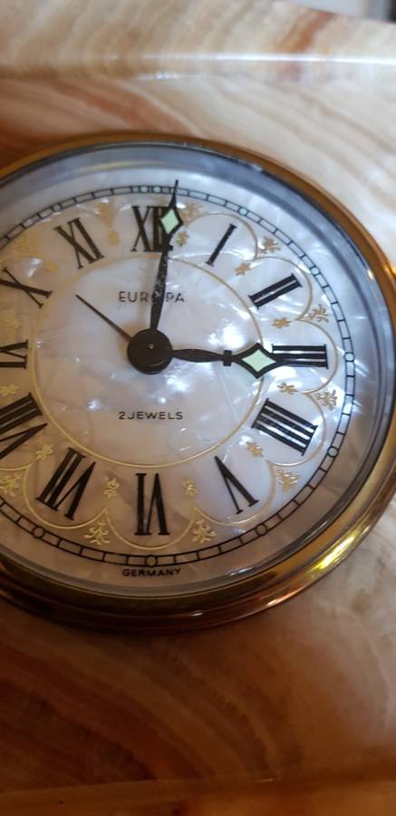 Absolutely stunning Europa Mantel piece clock from Germany. There is a small chip on one of the corners as pointed out in the photos. This is a wind up clock no batteries. I am also not sure how this works or even if it does work. Bought as is and selling as is